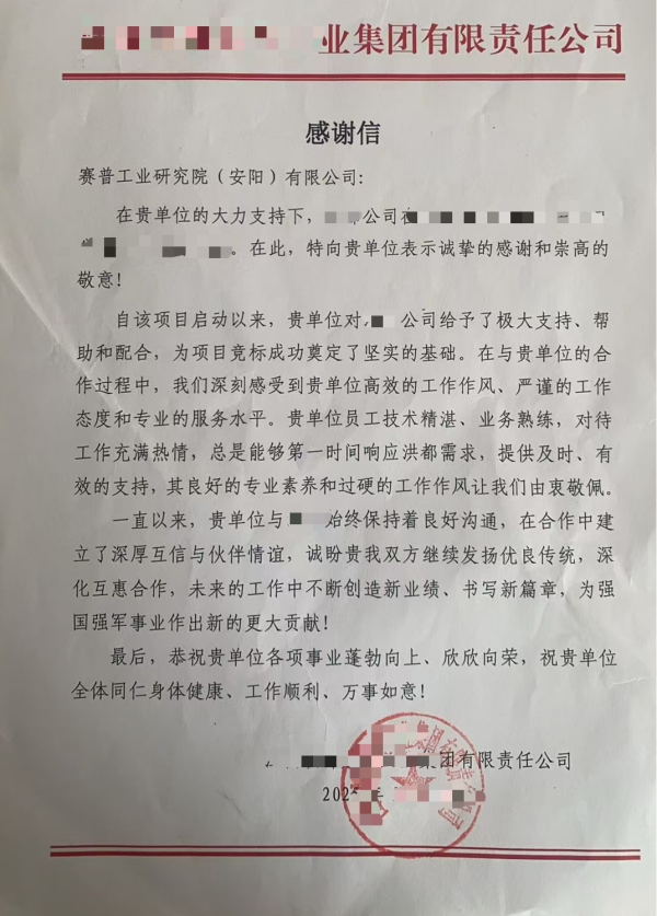 近期,賽普工業(yè)研究院(安陽(yáng))有限公司(以下簡(jiǎn)稱“賽普公司”)再次收到來自客戶的感謝信,客戶對(duì)公司在某特種裝備生產(chǎn)任務(wù)中提供的卓越支持予以高度評(píng)價(jià)。今年以來,賽普公司已多次獲得客戶的書面感謝和電話感謝。贊譽(yù)的背后,是市場(chǎng)與客戶對(duì)賽普公司技術(shù)實(shí)力、服務(wù)品質(zhì)與履約精神的高度認(rèn)可與信賴。